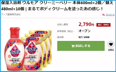 終了 アース製薬 保湿入浴液 ウルモア クリーミーベリーの香りの商品ページ