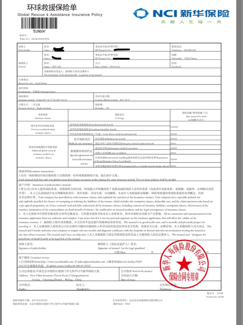 旅游保险 申根签证保险