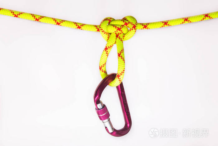 新的粉红色椭圆形旅游和登山驼挂蝴蝶结 彩色的 绿色的绳子 用于个人安全 自保胡子 孤立的白色背景 照片 正版商用图片27fo6q 摄图新视界