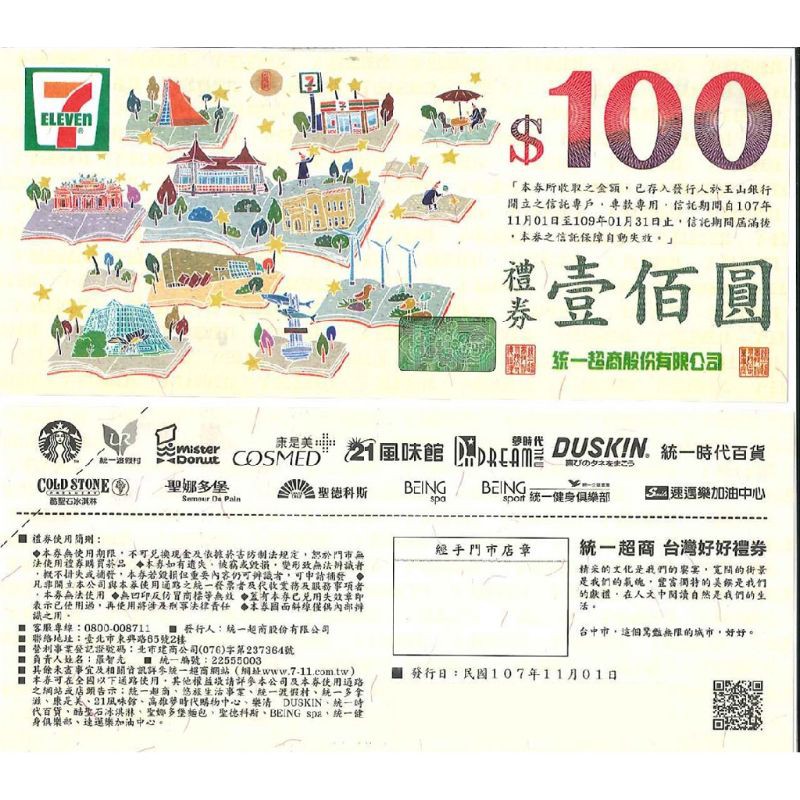7 11禮券 康是美 星巴克 統一時代百貨 夢時代 聖娜多保麵包等都可使用 1張