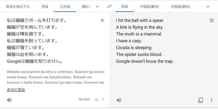 一体なぜ 最近精度が下がったと思われるgoogle翻訳 蝙蝠 をランダムな単語に訳してしまうらしい 漢字読めない子か togetter